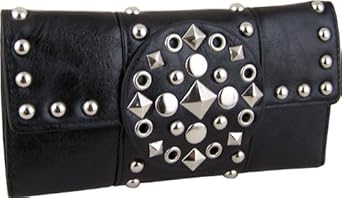 This tri-fold black leather-like wallet features silver metal hardware on the front and back. The front snap closure holds the wallet securely closed when not in use. This wallet features 12 slots for credit cards and two spaces for ID. Two long spaces inside for cash and receipts. A removable checkbook holder features 4 credit card slots and one space for ID.