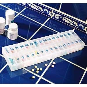 Pill Dispenser organizes a monthly supply in easy to access ABS plastic case. Now do the job once instead of every week! 31 days plus an extra slot, 1 1/ 4 x 3 1/ 2 x 11 1/ 4".